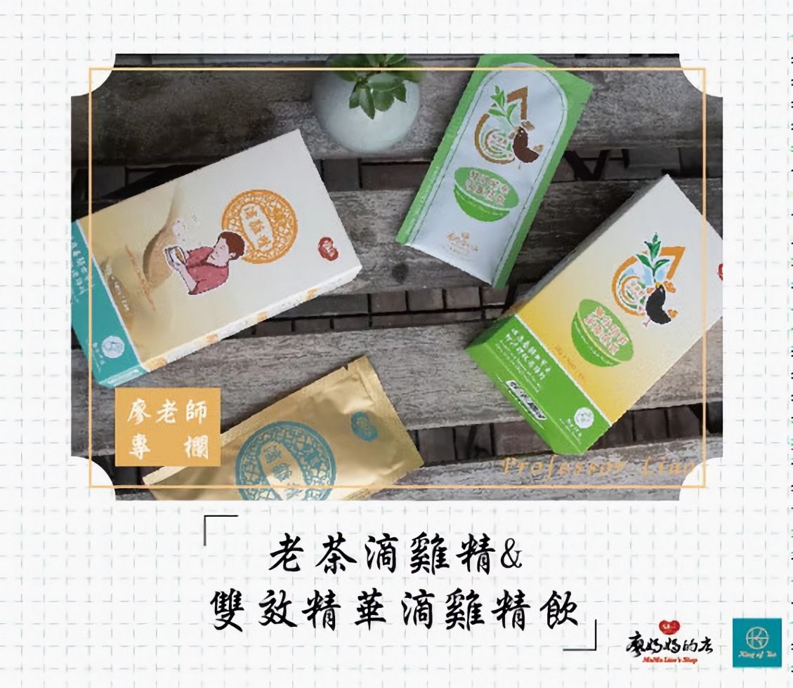 雙效精華滴雞精飲則添加新年份的輕發酵烏龍茶,主打其花香及超高濃度的兒茶素,高達7964.7 μg/g,另外輕發酵烏龍茶接近綠茶,維他命c的含量也很高,對健康很有助益,這個部分跟老茶的成分與風味大大不同,老茶被很多研究證實,其效能等同於靈芝。